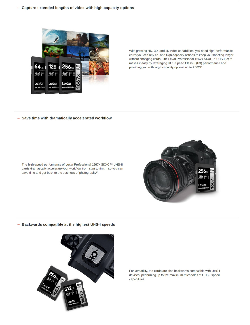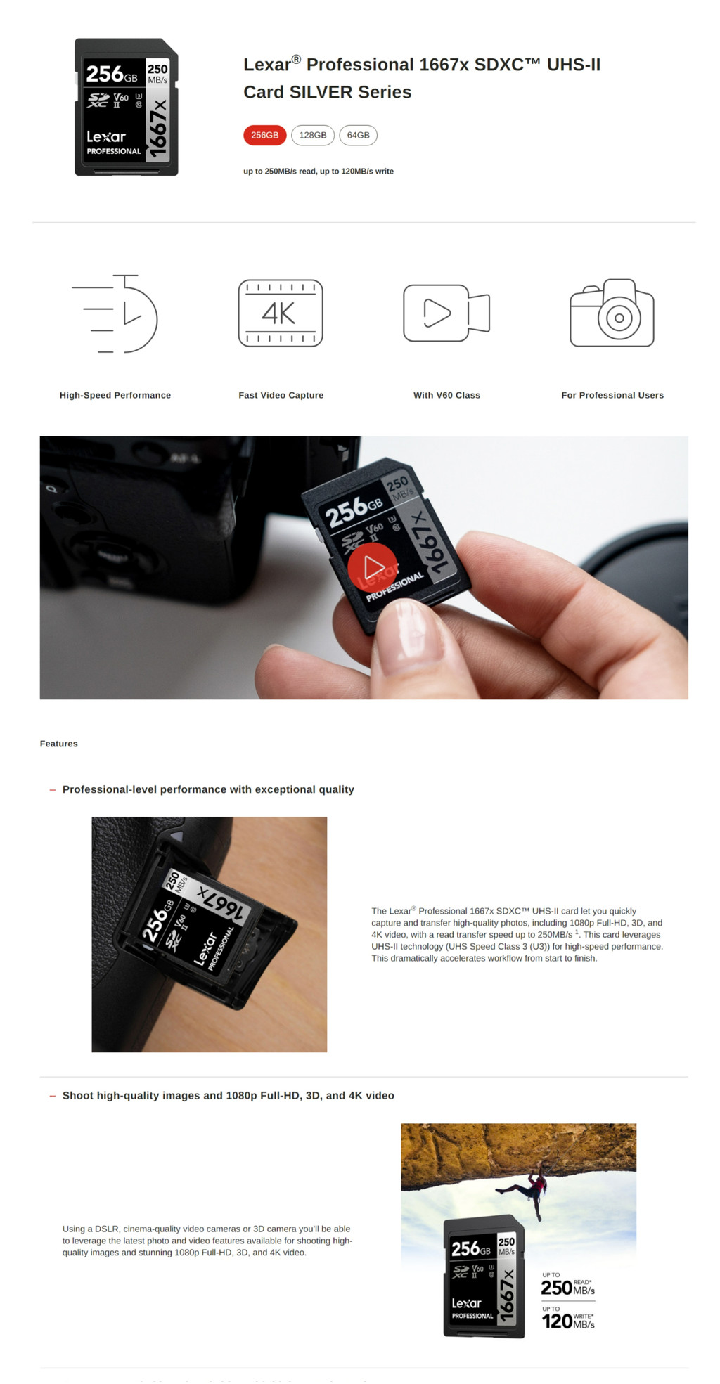 - การ์ดประสิทธิภาพสูง เหมาะกับการใช้ถ่ายภาพแบบ 1080p Full-HD, 3D และ 4K