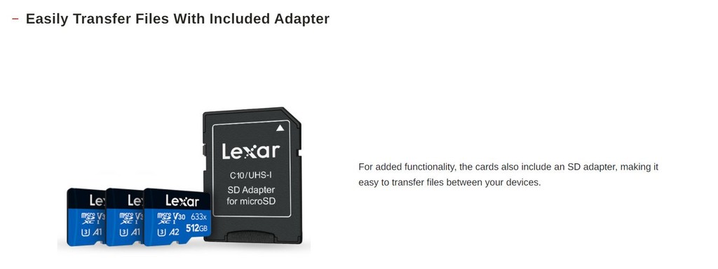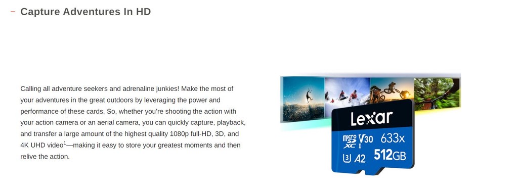 Lexar 633x microSDHC/microSDXC UHS-I Memory Card no Adapter ✅ ออกแบบมาเพื่อใช้งานร่วมกับ Smartphones, Tablets, และ Action Cameras ✅ ถ่ายภาพ ถ่ายโอนวิดีโอ 1080p full-HD, 3D และ 4K UHD คุณภาพสูงได้อย่างรวดเร็ว ✅ ดาวน์โหลดหรือบันทึกไฟล์ได้อย่างรวดเร็ว รวมถึงภาพยนตร์ รูปภาพ และเพลงคุณภาพสูงสุด ✅ up to 100MB/s read