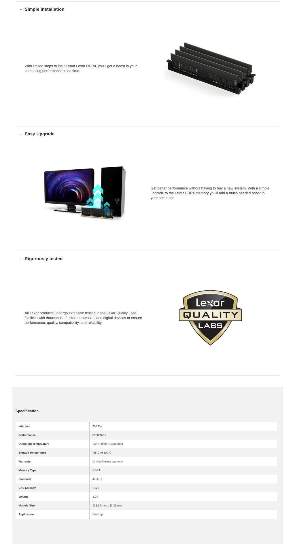 Specification ● Capacity : 4GB/8GB ● Interface : 288 Pin ● Performance : 3200Mbps ● Operating Temperature : -20° C to 85°C (Surface) ● Storage Temperature : -55°C to 100°C ● Memory Type : DDR4 ● Standard : JEDEC ● CAS Latency : CL22 ● Voltage : 1.2V ● Module Size : 133.35 mm x 31.25 mm ● Application : Desktop