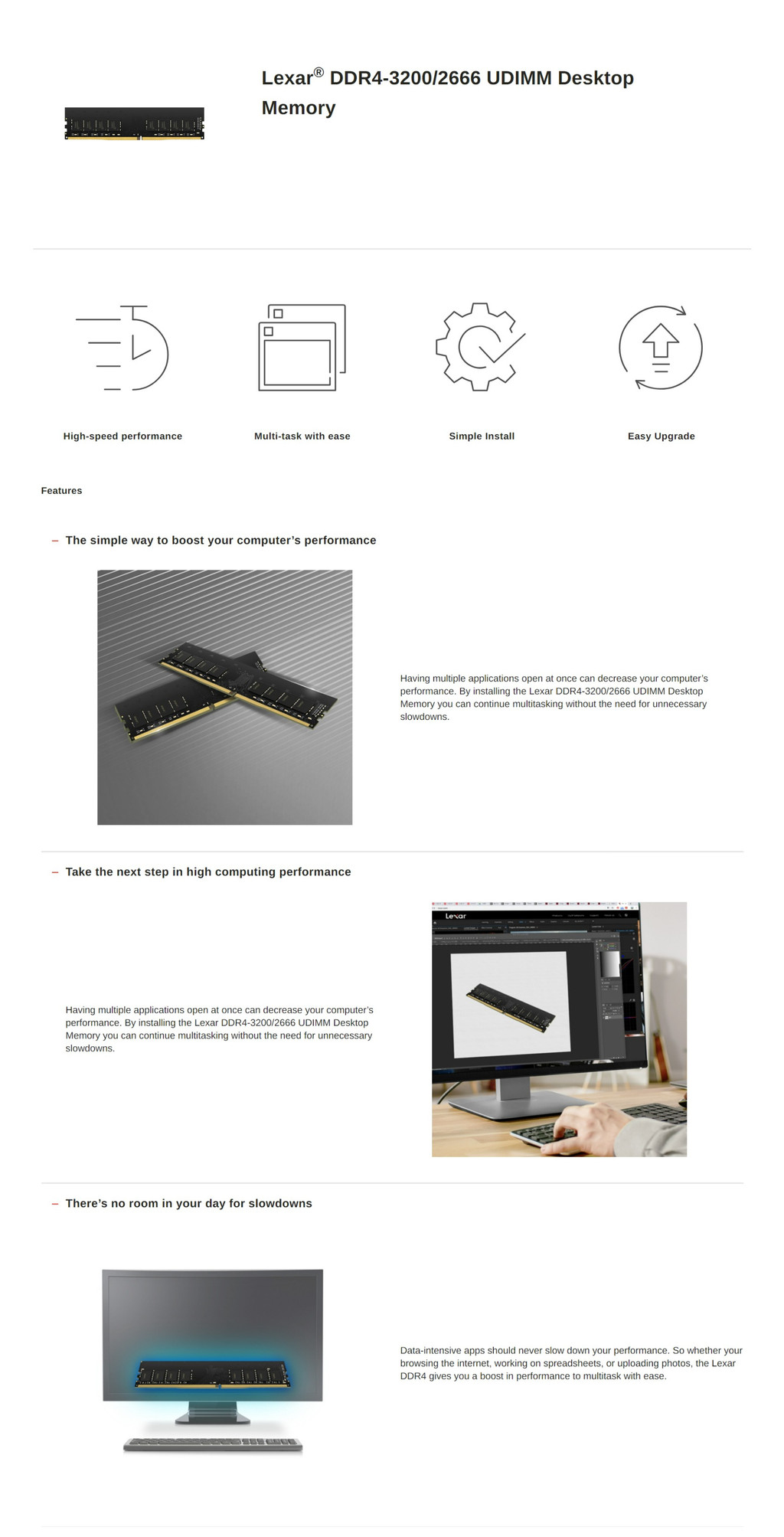 Lexar® DDR4 3200 U-DIMM Desktop Memory ✅ High-speed performance หน่วยความจำสำหรับแล็ปท็อป Lexar DDR4 ช่วยอัพเกรดประสิทธิภาพแล็ปท็อปของคุณ ให้การทำงานที่เร็วขึ้น ด้วยตอบสนองที่ดีกว่า และประหยัดเวลาในการโหลดแอปพลิเคชันหรือโปรแกรมต่างๆ คุณสามารถทำงานหลายอย่างพร้อมกันได้โดยไม่จำเป็นต้องทำงานช้าลงแบบไม่จำเป็น ✅ Multi-task with ease โปรแกรมที่ใช้ข้อมูลมากไม่ควรทำให้ประสิทธิภาพแล็ปท็อปของคุณช้าลง ดังนั้น ไม่ว่าคุณจะท่องอินเทอร์เน็ต ทำงานบนสเปรดชีต หรืออัปโหลดรูปภาพ Lexar DDR4 จะช่วยเพิ่มประสิทธิภาพในการทำงานมัลติทาสก์ของคุณได้เป็นอย่างดี ✅ Simple Install ติดตั้งง่าย พร้อมใช้งานในเวลาไม่นาน คุณจะได้รับการเพิ่มประสิทธิภาพในการประมวลผลแบบทันที ✅ Easy Upgrade มอบประสิทธิภาพที่ดีขึ้นโดยไม่ต้องซื้อใหม่ ด้วยการอัปเกรดหน่วยความจำ Lexar DDR4 อย่างง่าย คุณจะเพิ่มประสิทธิภาพที่จำเป็นให้กับคอมพิวเตอร์ของคุณได้เอง ✅ ผลิตภัณฑ์ Lexar ทั้งหมดผ่านการทดสอบ Lexar Quality Labs เพื่อให้มั่นใจในประสิทธิภาพ คุณภาพ ความเข้ากันได้ และความน่าเชื่อถือ