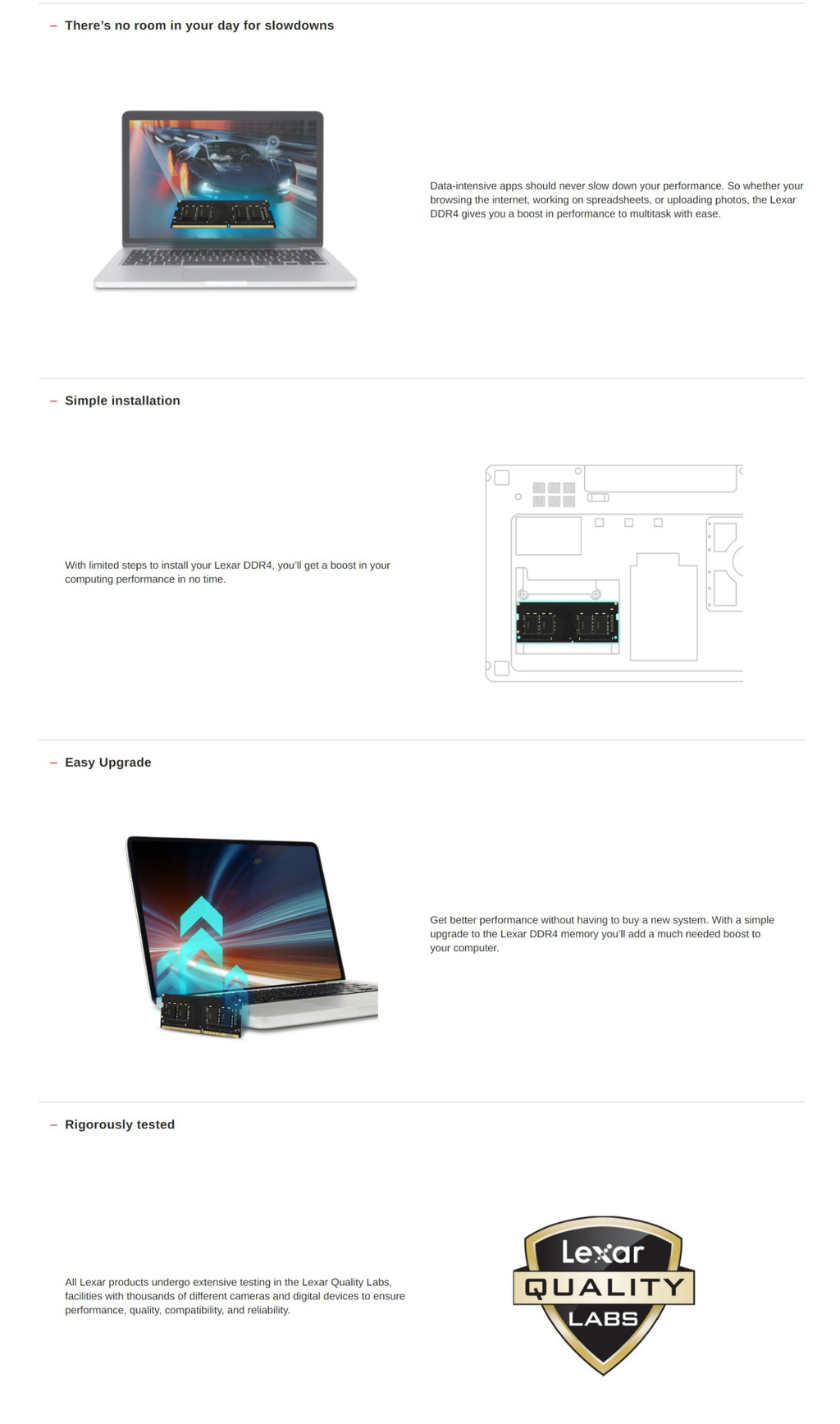 ✅ High-speed performance หน่วยความจำสำหรับแล็ปท็อป Lexar DDR4 3200 SO-DIMM ช่วยอัพเกรดประสิทธิภาพแล็ปท็อปของคุณ ให้การทำงานที่เร็วขึ้น ด้วยตอบสนองที่ดีกว่า และประหยัดเวลาในการโหลดแอปพลิเคชันหรือโปรแกรมต่างๆ คุณสามารถทำงานหลายอย่างพร้อมกันได้โดยไม่จำเป็นต้องทำงานช้าลงแบบไม่จำเป็น ✅ Multi-task with ease โปรแกรมที่ใช้ข้อมูลมากไม่ควรทำให้ประสิทธิภาพแล็ปท็อปของคุณช้าลง ดังนั้น ไม่ว่าคุณจะท่องอินเทอร์เน็ต ทำงานบนสเปรดชีต หรืออัปโหลดรูปภาพ Lexar DDR4 จะช่วยเพิ่มประสิทธิภาพในการทำงานมัลติทาสก์ของคุณได้เป็นอย่างดี ✅ Simple Install ติดตั้งง่าย พร้อมใช้งานในเวลาไม่นาน คุณจะได้รับการเพิ่มประสิทธิภาพในการประมวลผลแบบทันที ✅ Easy Upgrade มอบประสิทธิภาพที่ดีขึ้นโดยไม่ต้องซื้อใหม่ ด้วยการอัปเกรดหน่วยความจำ Lexar DDR4 อย่างง่าย คุณจะเพิ่มประสิทธิภาพที่จำเป็นให้กับคอมพิวเตอร์ของคุณได้เอง ✅ ผลิตภัณฑ์ Lexar ทั้งหมดผ่านการทดสอบ Lexar Quality Labs เพื่อให้มั่นใจในประสิทธิภาพ คุณภาพ ความเข้ากันได้ และความน่าเชื่อถือ