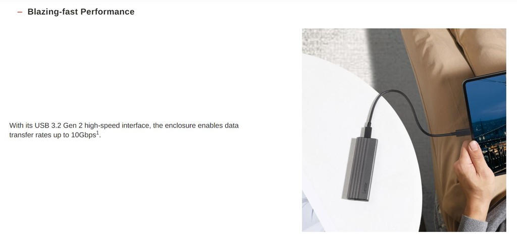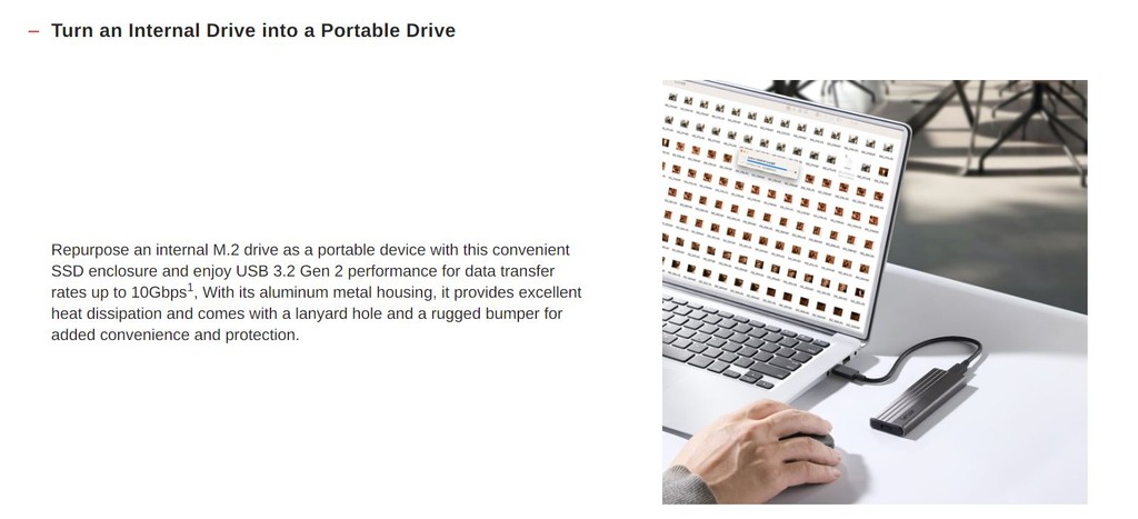 กล่องสำหรับแปลง M.2 NVMe SSD ให้เป็น External drive โอนข้อมูลสูงถึง 10Gbps แข็งแรง ทนทาน Repurpose an internal M.2 drive as a portable device with this convenient SSD enclosure and enjoy USB 3.2 Gen 2 performance for data transfer rates up to 10Gbps1, With its aluminum metal housing, it provides excellent heat dissipation and comes with a lanyard hole and a rugged bumper for added convenience and protection