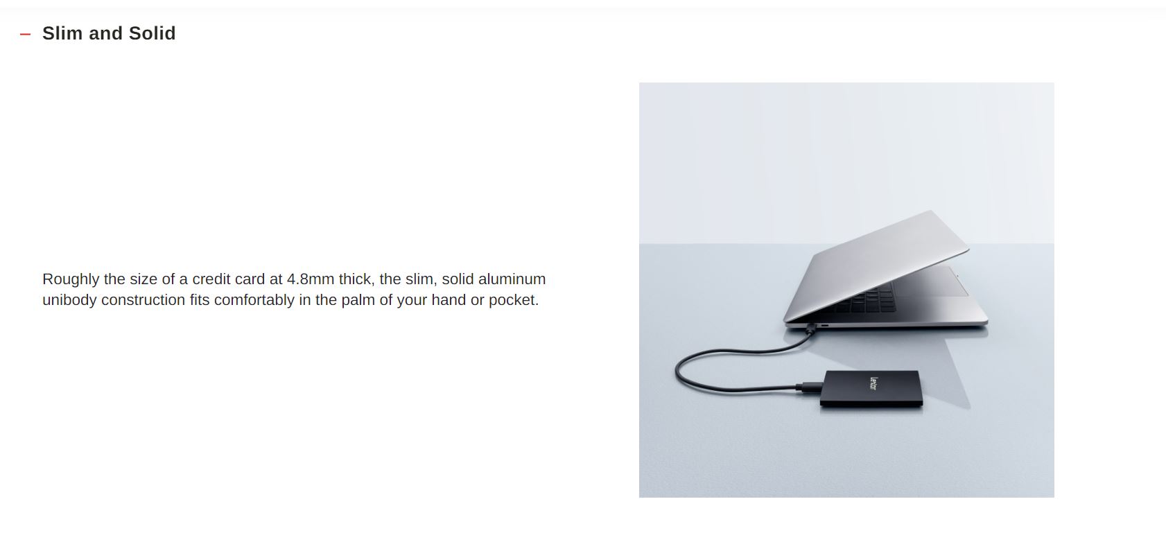 ✅Read & Write Speed * Read up to : 2000 MB/s * Write up to : 1800 MB/s ✅Interface : USB 3.2 Gen 2x2 รองรับความเร็วสูงสุด 20Gb/s ✅โครงสร้างอะลูมิเนียม Unibody เพรียวบางและแข็งแกร่งมีขนาดประมาณบัตรเครดิตที่ความหนา 4.8 มม. ใส่ไว้ในอุ้งมือหรือกระเป๋าเสื้อได้อย่างสบาย ✅SSD แบบพกพา Lexar® SL500 รองรับการบันทึก Apple Pro Res ถ่ายตรงไปยังไดรฟ์สูงสุด 4K 60FPS ด้วย iPhone 15 Pro และ iPhone 15 Pro Max ✅Lexar® SL500 Portable SSD เข้ากันได้กับพีซี, Mac, อุปกรณ์ Android, iPhone 15 series, เกมคอนโซล, กล้อง และอื่นๆ ✅มีซอฟต์แวร์ความปลอดภัยขั้นสูงพร้อมการเข้ารหัส AES 256 บิต ✅มาพร้อมสาย 1 เส้น * สาย USB Type-C เป็น Type-C ✅Size : 85mm x 54mm x 7.8mm(The thinnest part is 4.8mm) / น้ำหนัก : 43 กรัม ✅OS : Mac® OSX 10.6+, Windows® 11/10/7/8, Android 4.4+, Harmony OS ✅Warranty 5 year limited warranty ✅*** มี Magnetic set ในกล่อง