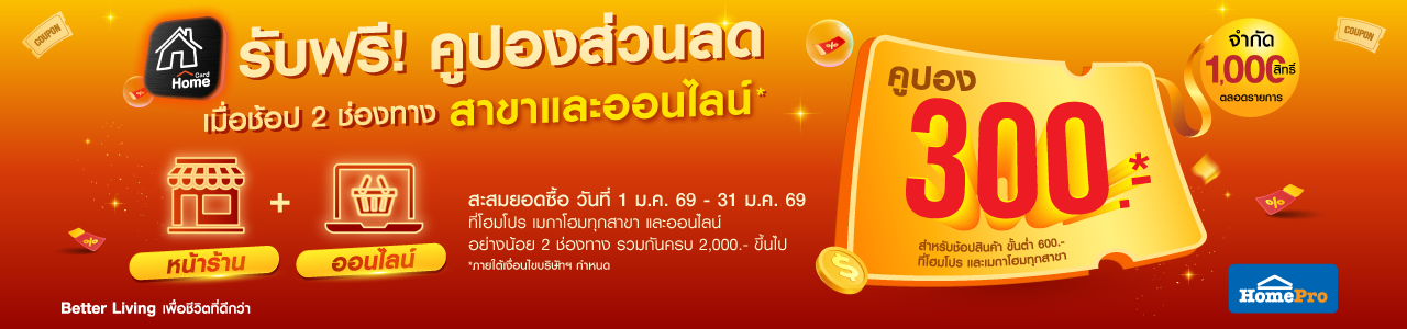 - สมาชิกโฮมการ์ดที่มียอดซื้อที่โฮมโปรและเมกาโฮม ทุกสาขา และโฮมโปรและเมกาโฮม ออนไลน์ (ไม่รวมการสั่งผ่าน LINE MAN และ GrabMart) รวมกันตั้งแต่ 2,000.- ขึ้นไป ระหว่างวันที่ 1 ม.ค. 69 - 31 ม.ค. 69 รับคูปองส่วนลดมูลค่า 300.-