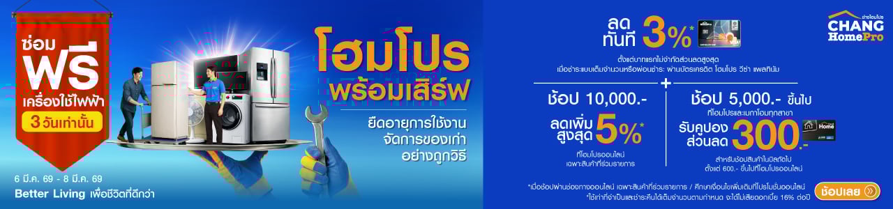 • Next Purchase สมาชิกโฮมการ์ด ช้อป 5,000. - ขึ้นไป ที่โฮมโปร และเมกาโฮม ทุกสาขา ในวันที่ 6 มีนาคม 2569 - 8 มีนาคม 2569 รับคูปองส่วนลด มูลค่ำ 300.-* สำหรับช้อปสินค้าในบิลถัดไป ตั้งแต่ 600.- ขึ้นไป ที่โฮมโปรออนไลน์ และเมกาโฮมออนไลน์ (จำกัดการกลับมาใช้ 1,500 สิทธิ์ตลอดรายการ / 1 หมายเลขโฮมการ์ด / 1 สิทธิ์ / ตลอดรายการ) วันที่ 6 มีนาคม 2569 - 15 มีนาคม 2569