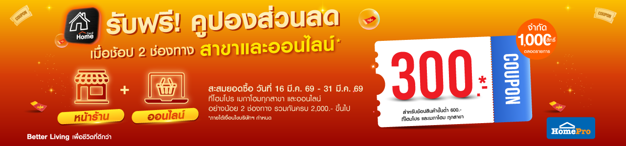 - คูปองส่วนลด มูลค่า 300.-* ขั้นต่ำ 600.- ต่อใบเสร็จที่โฮมโปร และเมกาโฮม ทุกสาขา